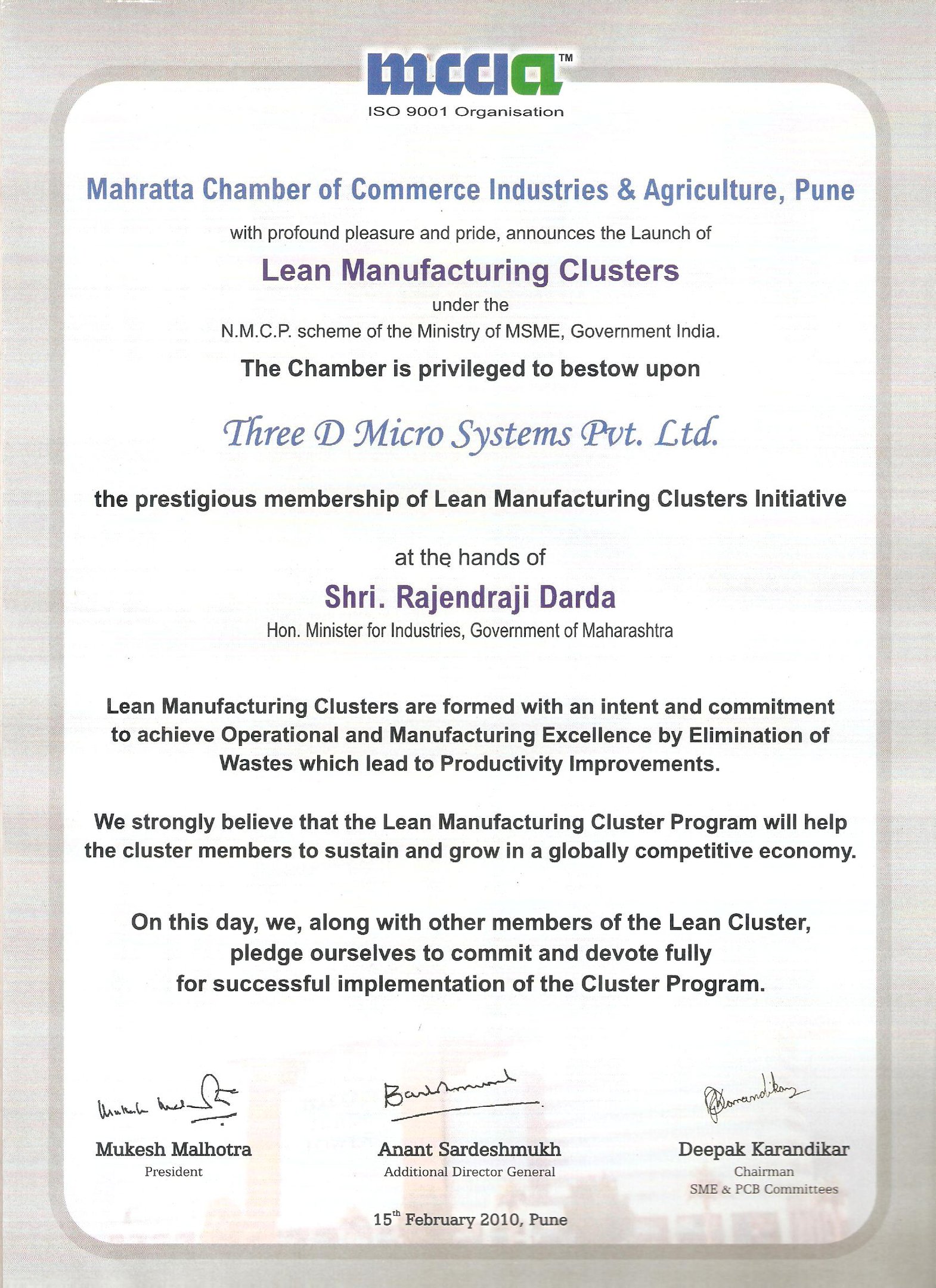 Three D Micro Systems Pvt. Ltd. is a proud member of the Lean Manufacturing Cluster Initiative under the Ministry of MSME, recognized by the Mahratta Chamber of Commerce Industries & Agriculture (MCCIA) for its commitment to operational excellence and productivity improvement.